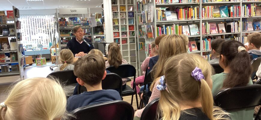 Heute besuchten die Zweitklässler der Möwenklasse und der Krabbenklasse die Stadtbibliothek Travemünde. Dort erwartete sie ein ganz besonderer Gast: der Kinderbuchautor Arne Rautenberg.